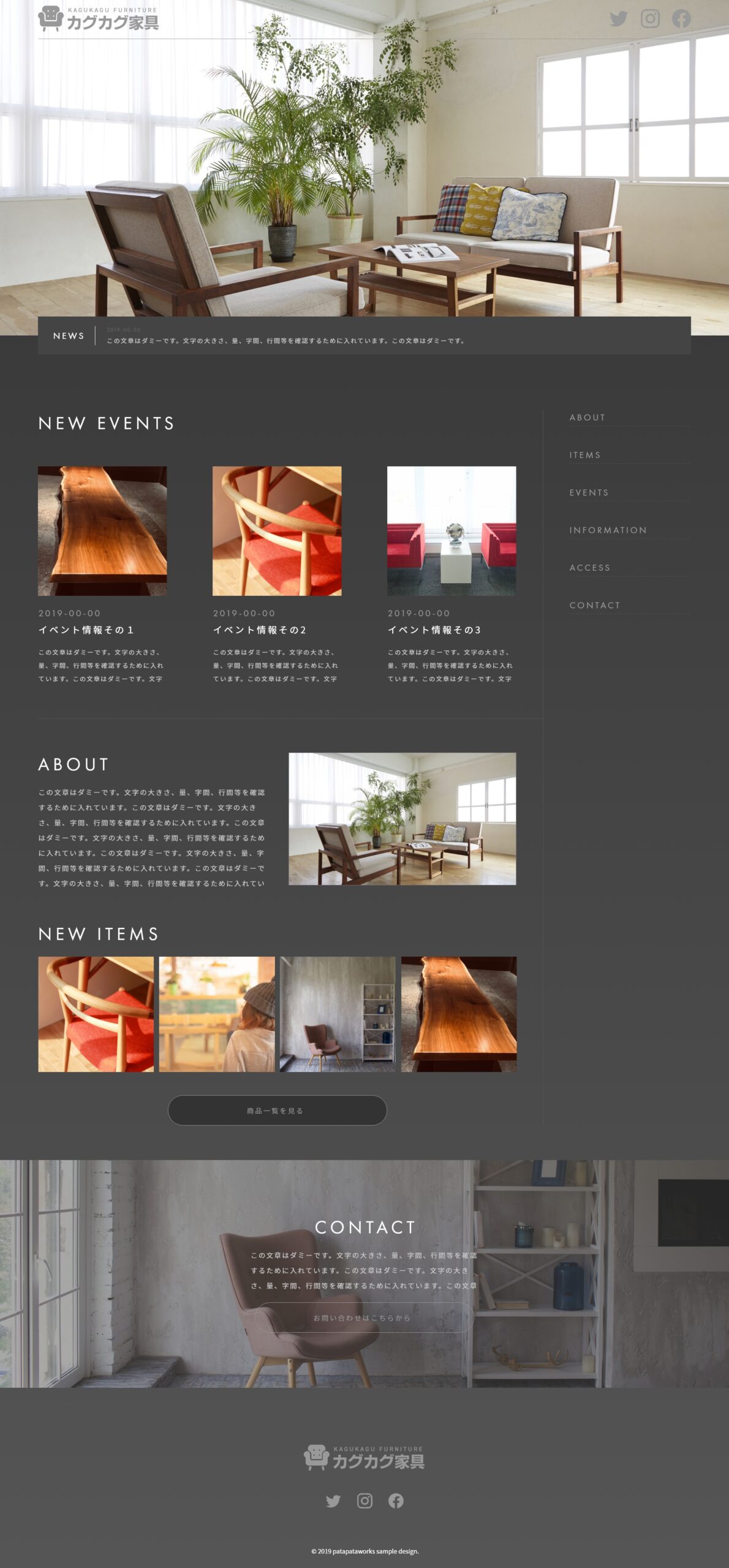 情報と写真のバランス: 「NEW EVENTS」や「NEW ITEMS」のように、テキストと写真を組み合わせたカード形式のデザインを採用しており、情報を整理しつつ視覚的に訴えかけています。