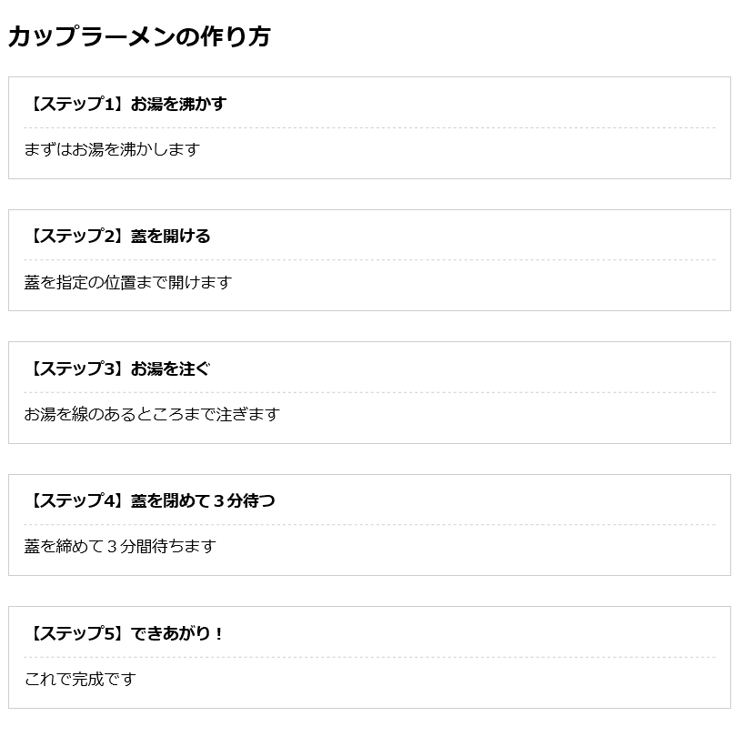 上記のHTMLとCSSを書くとこんな感じのコンテンツができます。簡単な作りですが、counterでステップの文字と数値を自動的に出力しています。このようにして使えば、olでの数値付き箇条書きよりもわかりやすいデザインを作ることができるようになると思います。